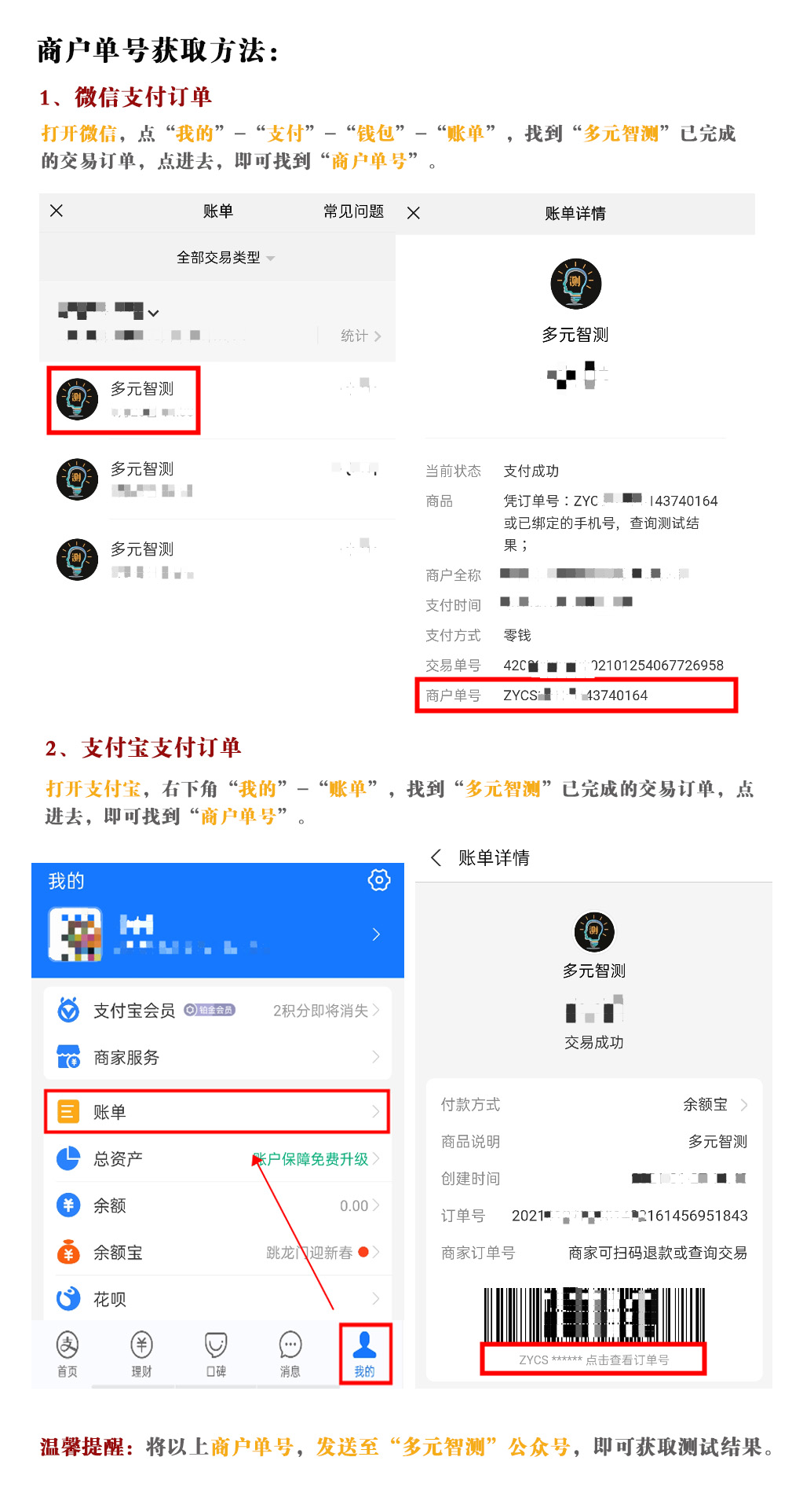 关注公众号“多元智测”,发送商户单号即可查询测试结果